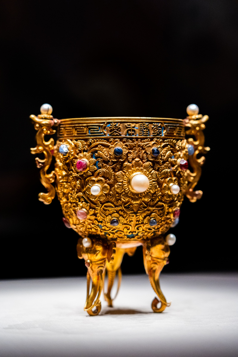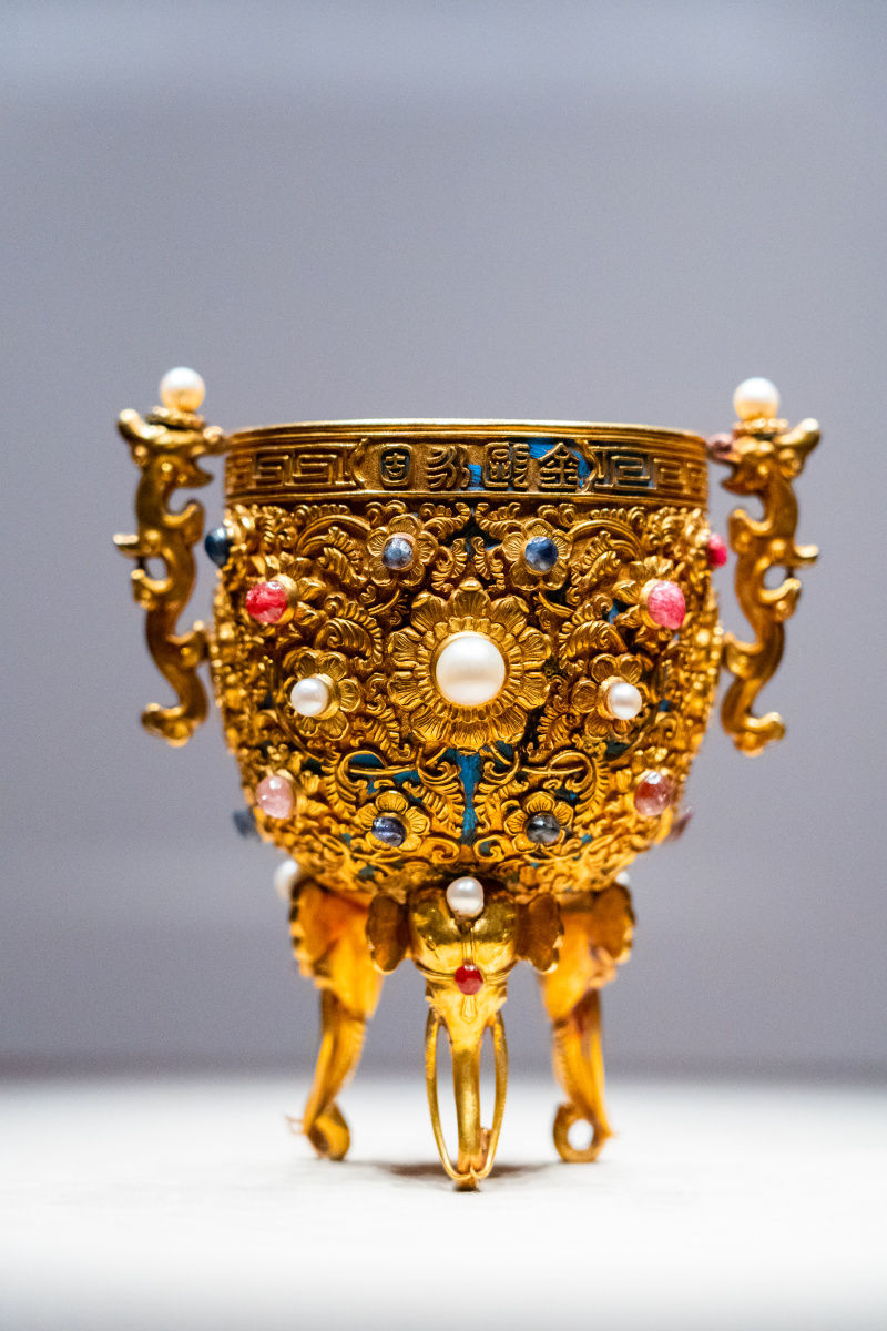 清乾隆金嵌宝金瓯永固杯是故宫博物院珍藏的一件国宝级文物,展现了清代乾隆时期高超的工艺水平和皇家奢华审美。此杯为金质,造型精美,装饰华丽,镶嵌有各色珍贵宝石,寓意“金瓯永固”,象征国家统一与繁荣昌盛。其设计融合了传统吉祥纹样和精湛的金属加工技艺,体现了清代宫廷匠人的卓越创造力。杯身以繁复的纹饰点缀,镶嵌的宝石光彩夺目,尽显皇家尊贵气质。这件器物不仅是实用器,更是艺术品,反映了乾隆皇帝对文化传承与权力象征的高度重视。作为故宫的重要藏品之一,“金瓯永固杯”承载了深厚的历史文化价值,也成为了中国古代工艺巅峰的代表作之一,吸引无数观众驻足赞叹。